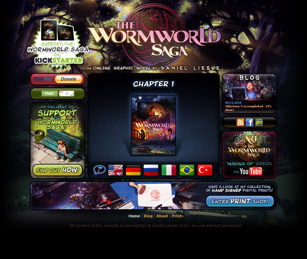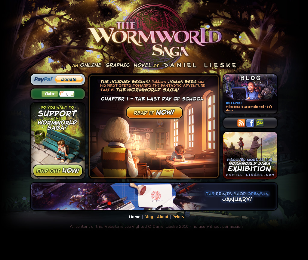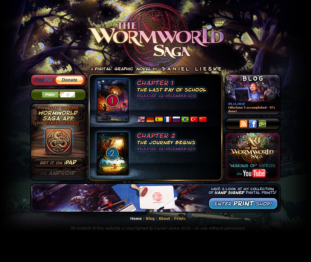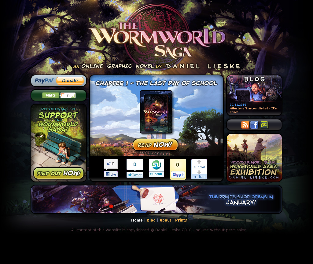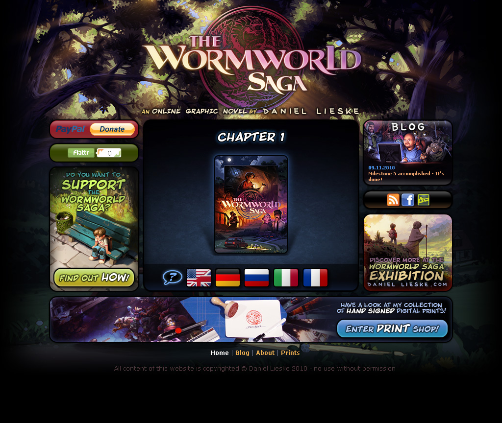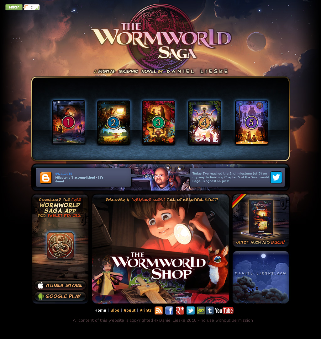 | The first version of the Wormworld Saga Website from December 2010. Almost a historic document today. Blogging and RSS were a thing back then and you could collect micro-donations via Flattr.