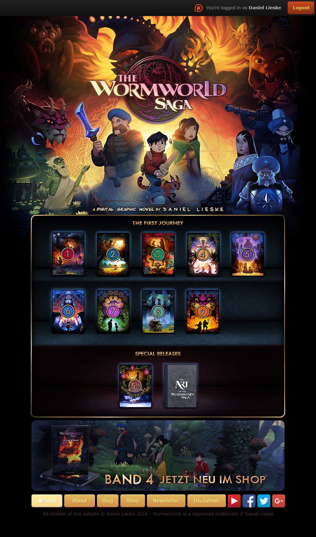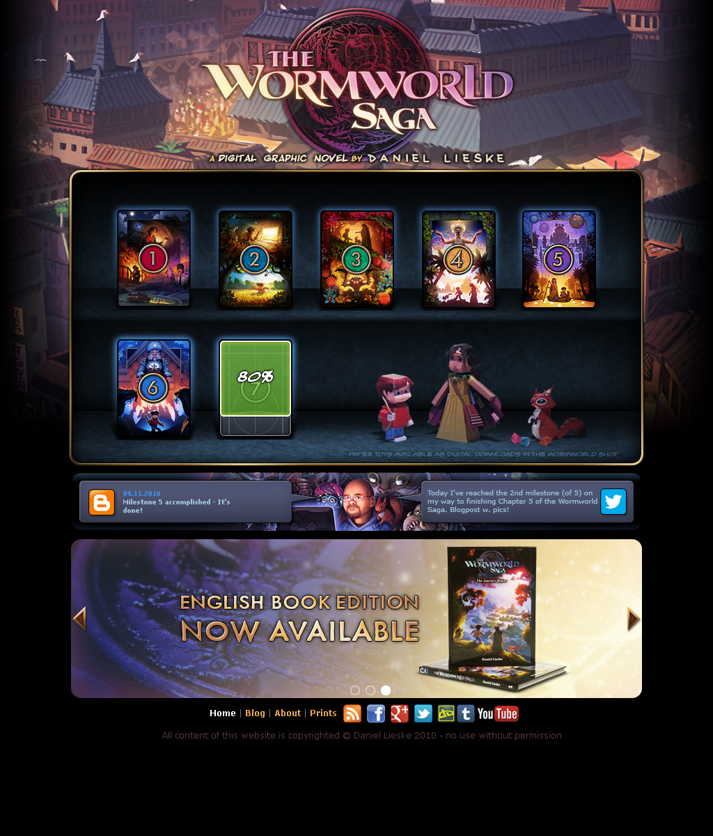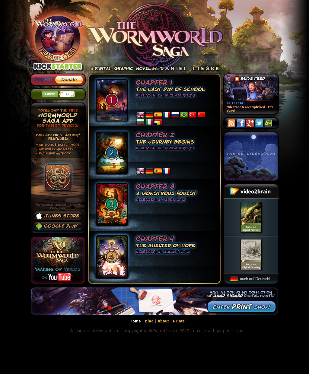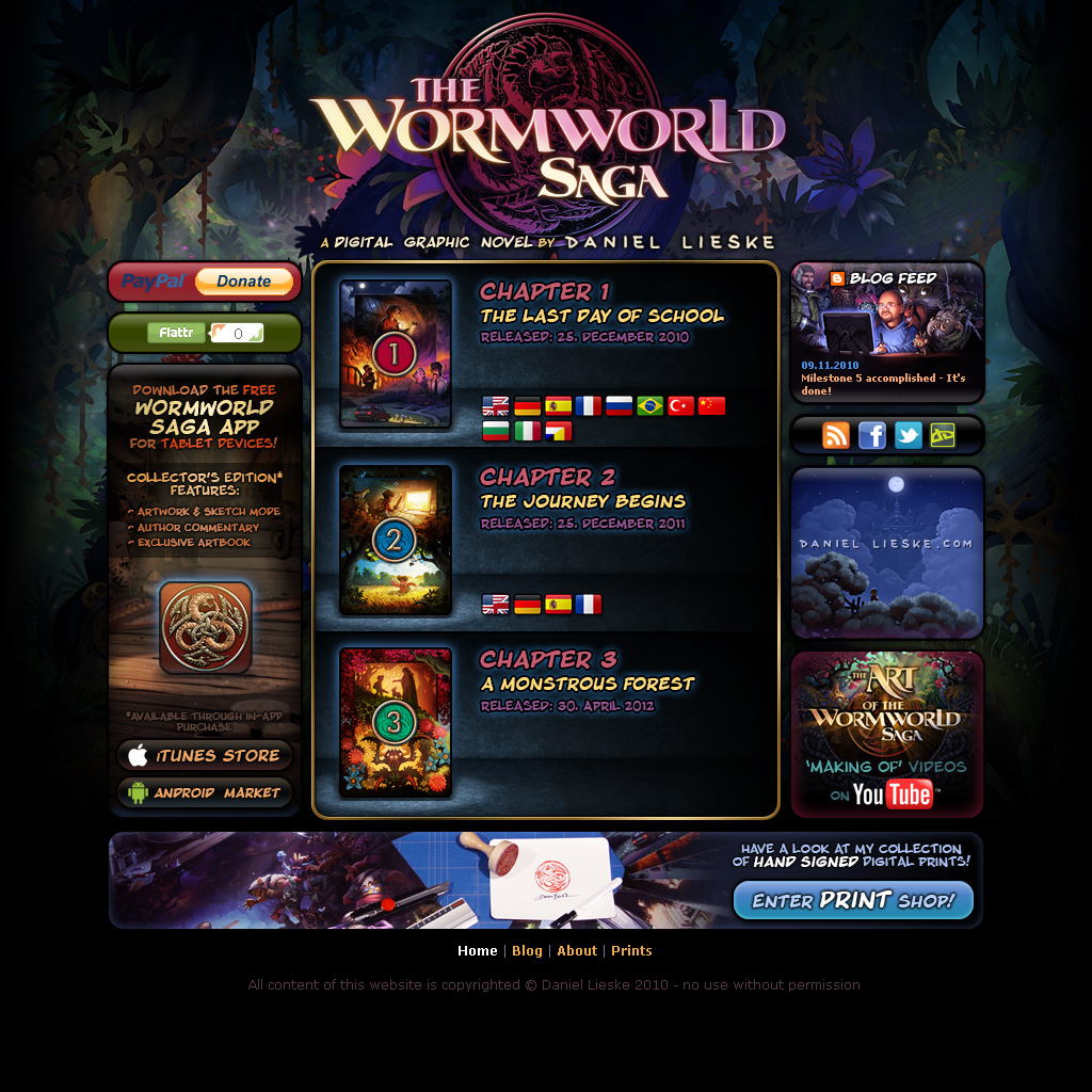 | The first version of the Wormworld Saga Website from December 2010. Almost a historic document today. Blogging and RSS were a thing back then and you could collect micro-donations via Flattr.